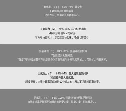 E强度帮你打下扎实的有氧基础,M强度是跑马拉松赛事时的平均配速,T 强度训练能够有效扩展跑者的有氧区间,A强度是T到I之间的无氧过渡区,I强度是为了刺激最大摄氧量的配速,R强度是在提升跑步的经济性。