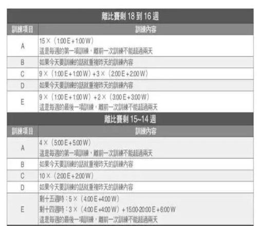 2K周期主要进行200米、400米、2K距离等短距离的组合训练,旨在提高2K的速度;10K周期包含部分短距离组合训练,A类(最重要的课表)的距离增加到10K;半马周期也一样。