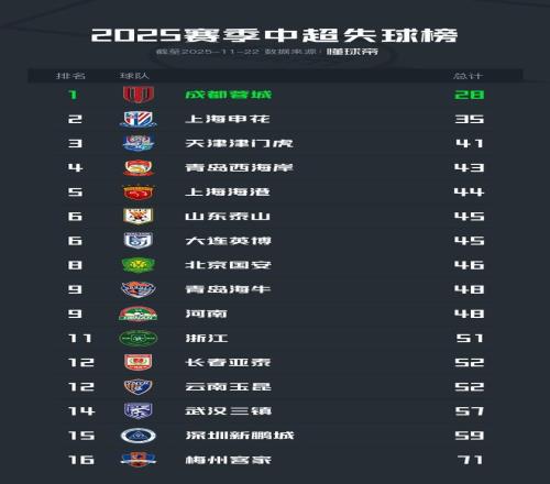 2025赛季中超丢球最少榜: