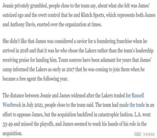 其四,2021年7月那笔拉塞尔·威斯布鲁克的交易,成为了珍妮·巴斯与詹姆斯关系恶化的重要转折点。当时,球队为了迎合詹姆斯的意愿推动了这笔交易,然而结果却是一场灾难。湖人在该赛季仅取得33胜49负的战绩,无缘季后赛。更让珍妮·巴斯不满的是,詹姆斯似乎试图撇清自己在推动这笔交易中的角色,缺乏应有的担当。据知情人士透露,珍妮·巴斯私下对詹姆斯这种“缺乏担当”以及在威少交易后“将责任推给他人”的做法极为不满。