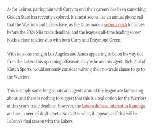 内讧传闻推动詹皇离开湖人名记:勒布朗或最终和库里联手