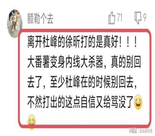 徐昕再次爆发,网友们也纷纷点赞。“徐昕现在新外号叫广州塔,罚球的时候被球迷喊MVP,这不好起来了吗!”;“上赛季一直说徐昕体能不好,现在都打30多分钟了,队里上场第一”;“事实证明,杜峰那一套过时了”;“离开杜峰的徐昕打的是真好!!!大番薯变身内线大杀器,真的别回去了,至少杜峰在的时候别回去,不然打出的这点自信又给骂没了。”;“又爆发了,你说我不行,我偏要做给你看,话说徐昕这孩子,是真争气啊!”……