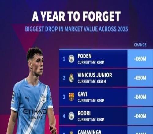 25年德转身价跌幅前10:福登跌6000万最高,维尼修斯跌5000万
